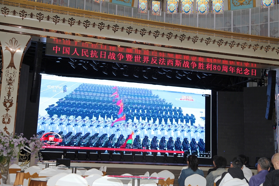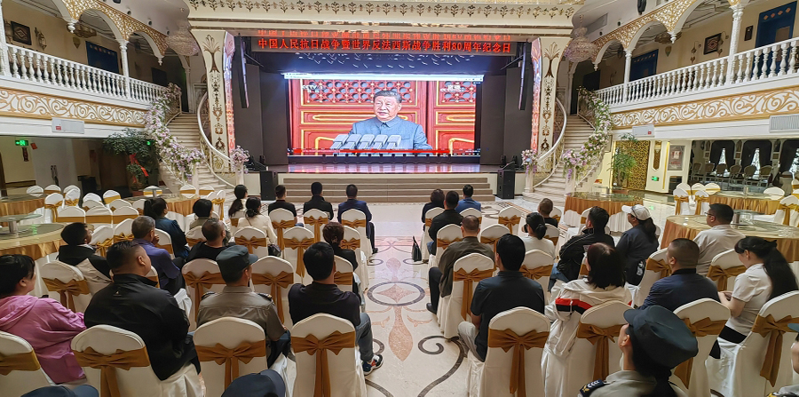 在这个特殊的日子里,新疆二道桥文旅集团精心组织员工集体观看阅兵仪式,二道桥出租汽车公司、天宝饰品商城、乌伦古湖黄金海岸景区等经营单位同步组织收看。二道桥大剧院大厅内,集团职能部门人员、二道桥大巴扎员工和商户代表、二道桥大剧院员工早早抵达现场,有序就座。当庄严的国歌奏响,全体员工起身肃立,齐声高唱国歌,眼神中饱含对祖国的热爱与崇高敬意。