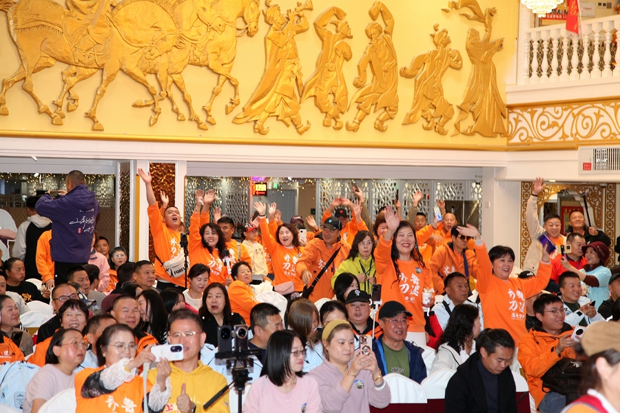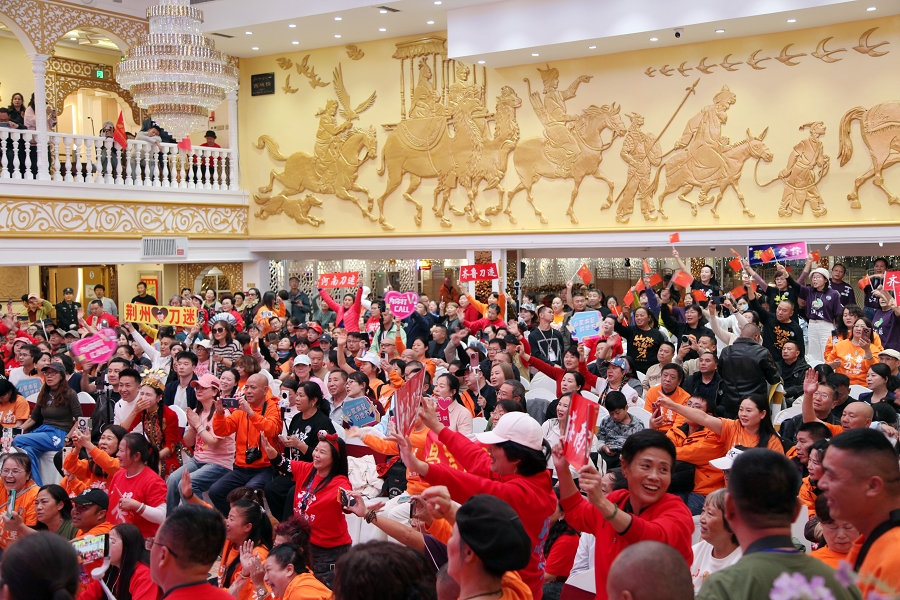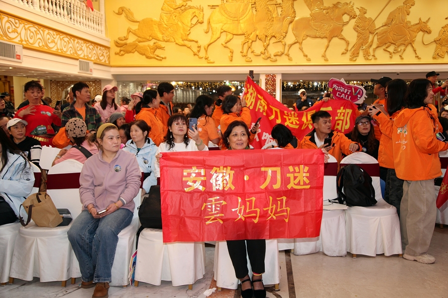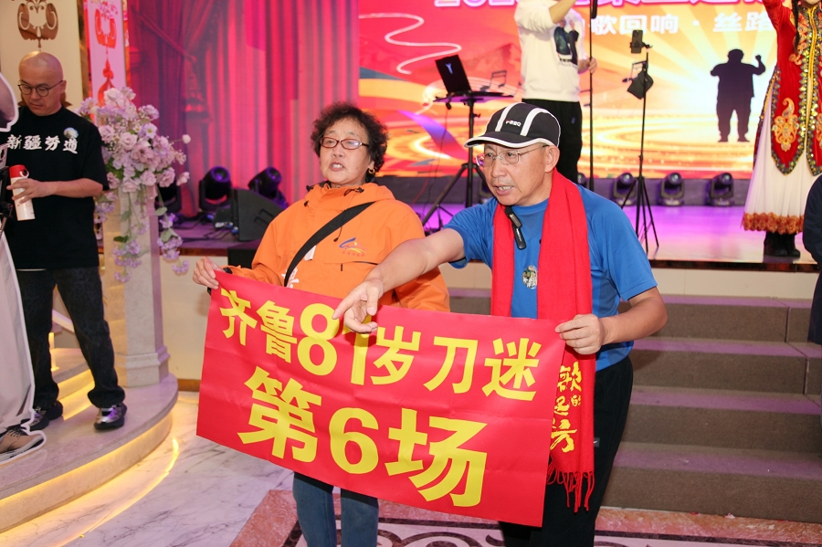 时值祖国76周年华诞和新疆维吾尔自治区成立70周年,活动特别设置红色经典展演环节。当《映山红》的旋律响起,全场刀迷挥舞国旗齐声合唱,激昂的歌声传递着对祖国的深情祝福,将现场气氛推向最高潮。