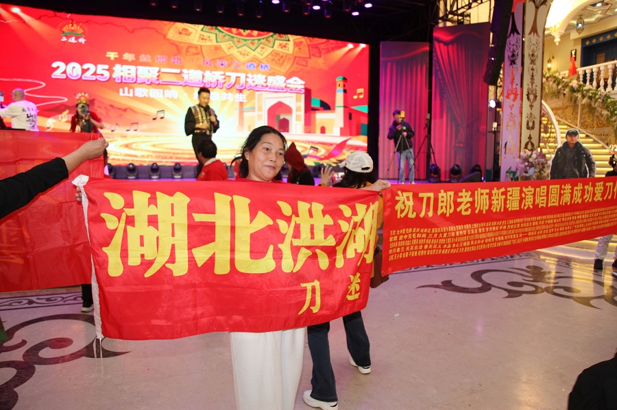 作为全国刀迷首次在疆举办的大型文化活动,本次盛会以刀郎经典作品为核心,构建中华传统文化传承与创新的展示平台。活动特别邀请新疆本土歌手刘科及知名刀迷代表新疆小古和阿华现场献艺,《2002年的第一场雪》《爱是你我》《喀什葛尔的胡杨》等代表作引发全场齐唱。二道桥歌舞团演员演绎的新疆民族舞蹈更添地域风情。活动期间,现场的全国刀迷共同录制《关于二道桥》大合唱视频,以音乐为媒介连接天山南北文化脉络。