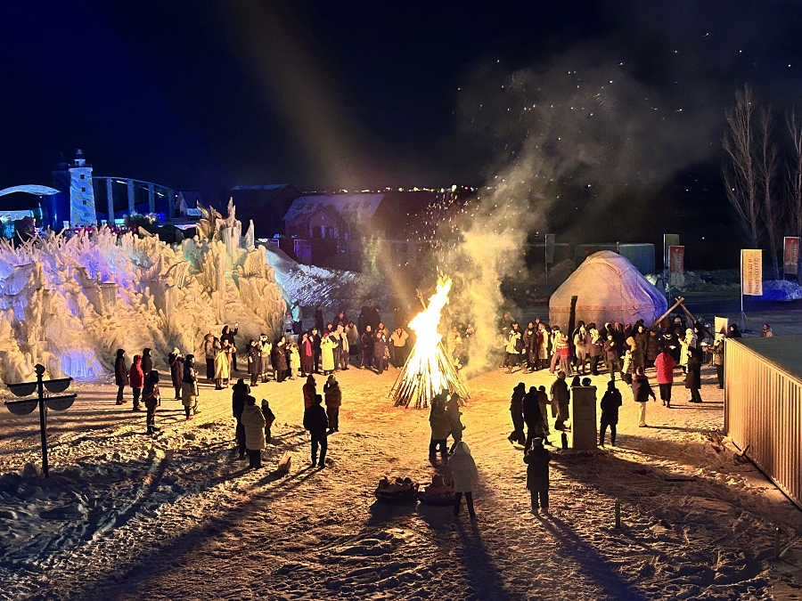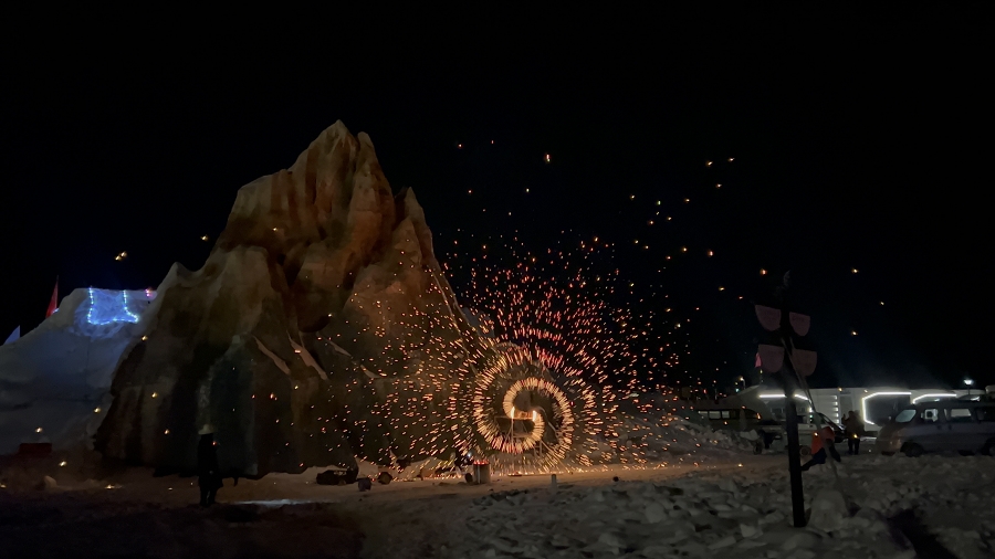 夜幕降临的黄金海岸更具风情。非遗打铁花表演震撼登场,万千铁花如星河坠落,与冰面倒影交相辉映;哈萨克族家访活动邀请游客走进民俗人家,在奶茶香中聆听民族团结故事,体验地道风土人情。