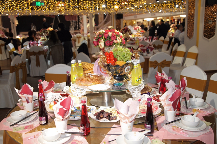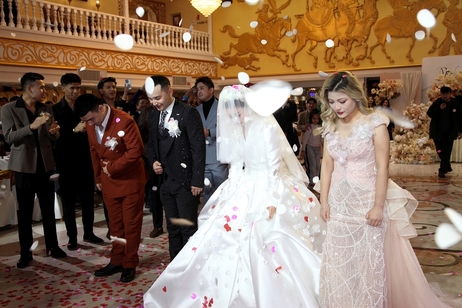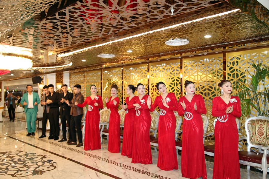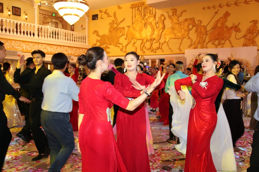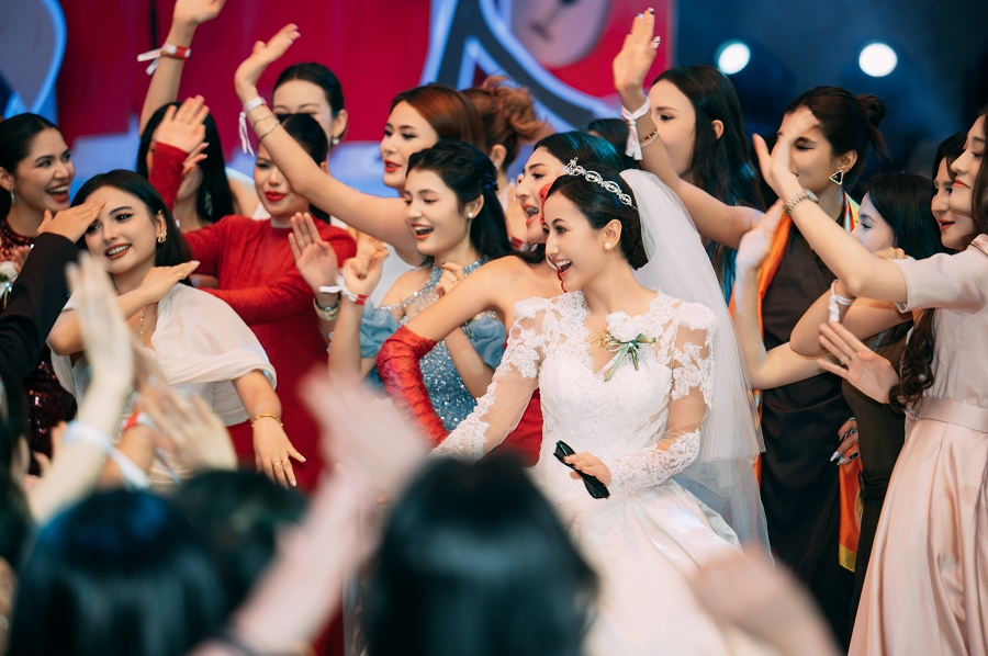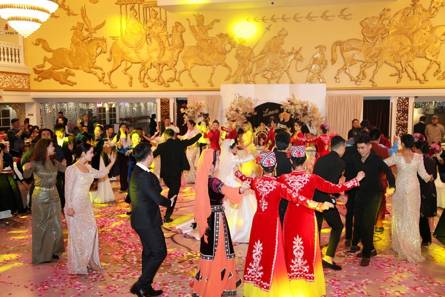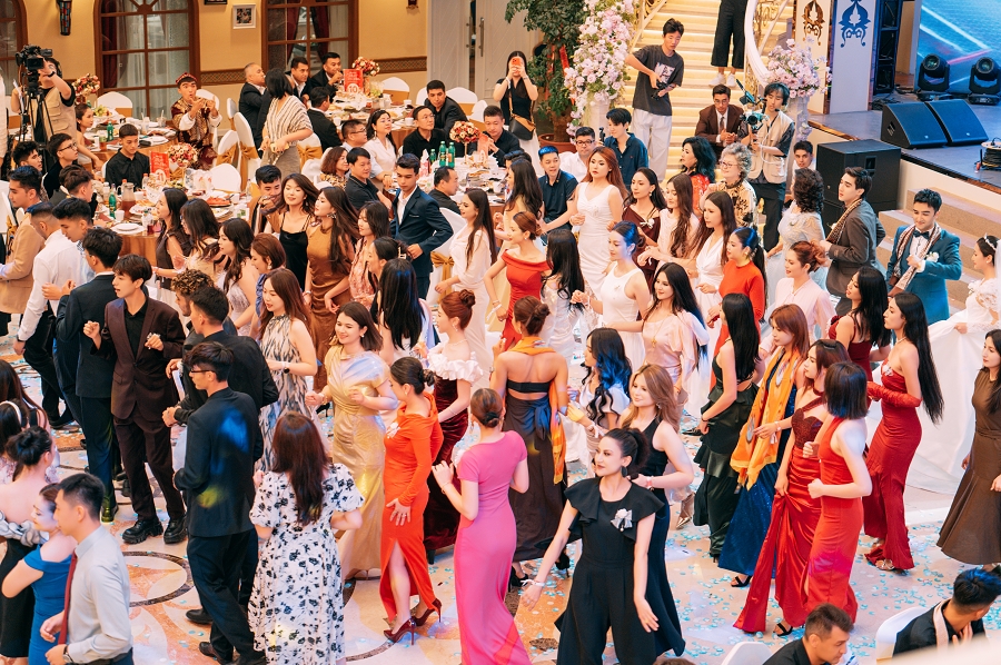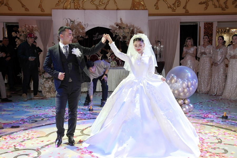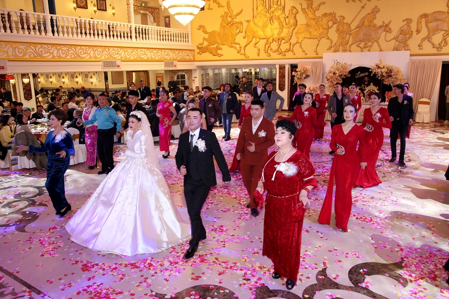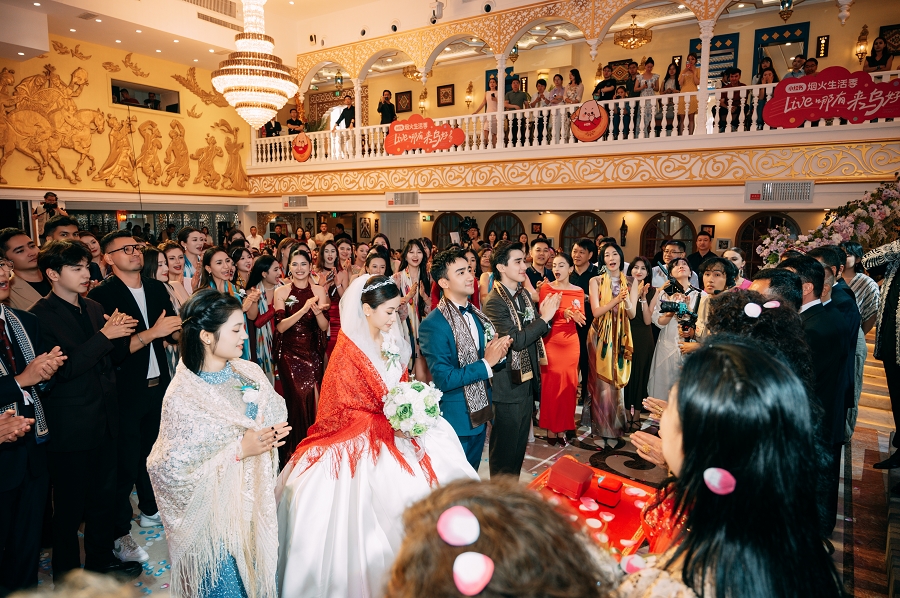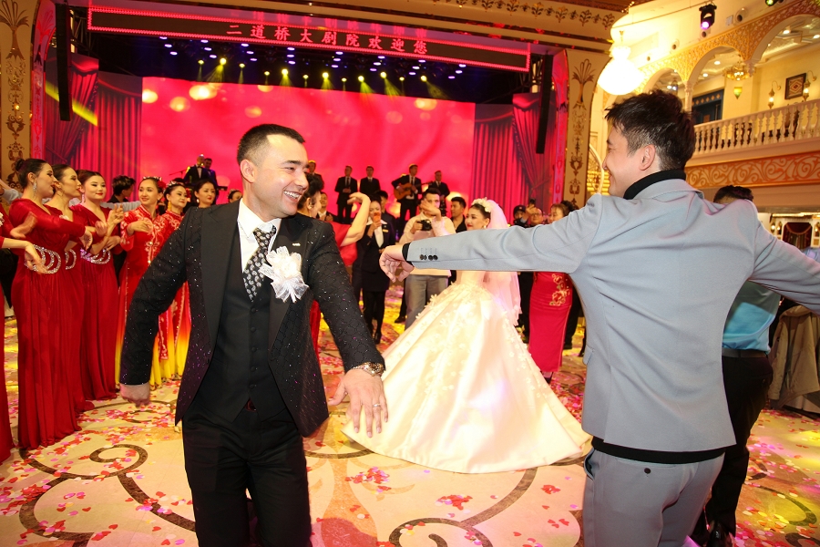 随后,阿凡提乐队奏响活力昂扬的曲目,传统手鼓的铿锵节奏、热瓦普的悠扬旋律与现代电音激情碰撞,独特韵律让现场氛围持续升温。身着民族特色服饰的伴郎伴娘率先起身,面带真挚笑容走向嘉宾席,热情发出邀约:“来呀朋友们,一起跳起来!”他们拉起嘉宾的手,围成一个个欢快的圆圈,新郎新娘更是步入人群中央,带领大家跳起麦西来甫经典集体舞。嘉宾们不分民族、不分年龄,纷纷循着节奏摆动身体,或模仿扭颈、摆腰的民族舞精髓,或跟着鼓点踏步拍手,艾德莱斯绸与各色衣物交织翻飞,歌声、笑声、欢呼声响彻整个剧院,俨然一场跨越隔阂、全民共享的幸福嘉年华,每一张笑脸都镌刻着对美好生活的向往。