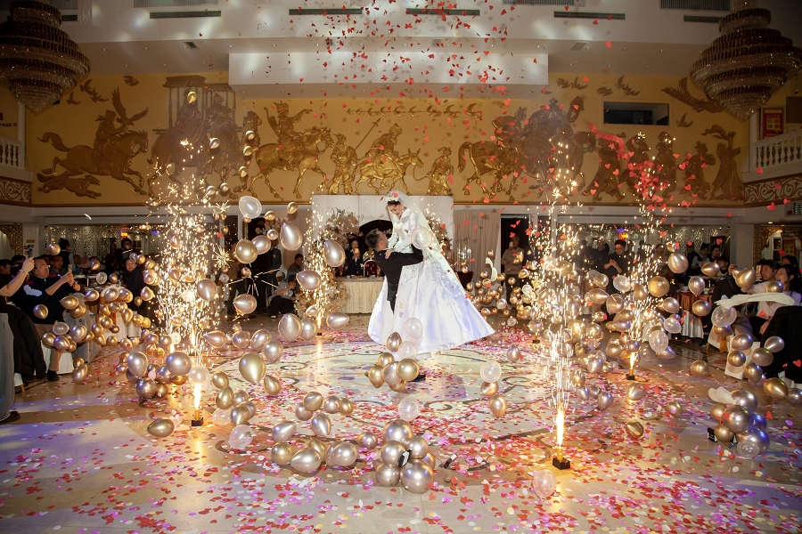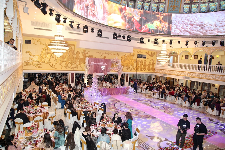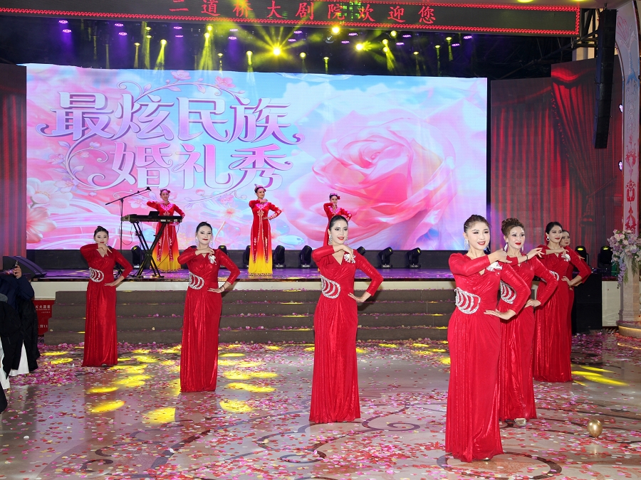 这场婚礼盛典堪称新疆多元民族婚庆文化的集大成之作,以 “幸福从二道桥启航”为情感主轴,将传承千年的婚俗礼仪与前沿数字科技完美交融。二道桥大剧院麦西来甫广场的巨型穹顶之下,精美的民族纹样与360度环绕数字大屏交相辉映,营造出穿越时空的沉浸式意境;哈孜・艾买提大师的巨幅手绘油画《歌舞之乡》通过动态投影技术鲜活重现,为“幸福启航”的核心理念写下生动注脚。