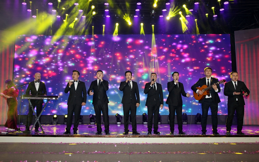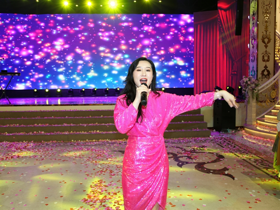 正当现场氛围热烈至顶峰,舞台灯光骤然聚焦,著名歌唱家夏米力老师登场。“亲爱的朋友们,祝新人幸福美满,祝新疆越来越好!”夏米力老师洪亮而富有感染力的声音响起,瞬间点燃全场热情。他倾情演绎经典曲目《二道桥子》,独特的民族唱腔与深情诠释让现场嘉宾深深沉醉。夏米力老师走下舞台,与新郎新娘亲切握手送上祝福,嘉宾们也跟着旋律轻声哼唱,不少人举起手机记录这动人瞬间,更有嘉宾自发拉起手再次围成圆圈,随着歌声欢快地起舞,舞台上下融为一体,互动达到高潮,将整场盛典的幸福感推向顶点。