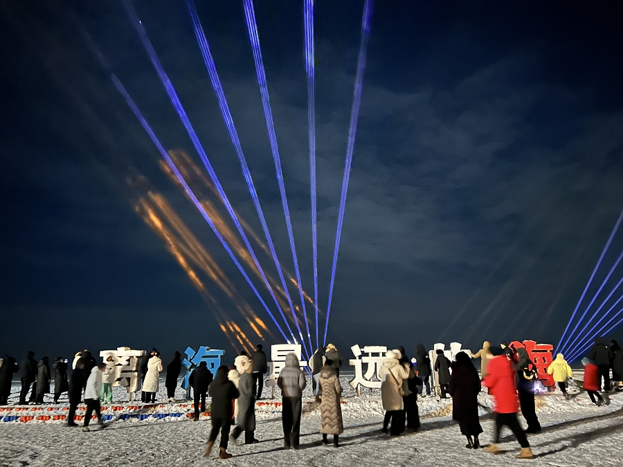 夜幕降临的黄金海岸更具风情。非遗打铁花表演震撼登场,万千铁花如星河坠落,与冰面倒影交相辉映;哈萨克族家访活动邀请游客走进民俗人家,在奶茶香中聆听民族团结故事,体验地道风土人情。
