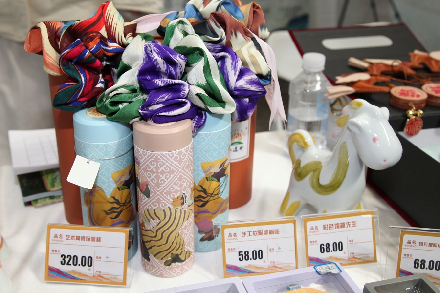 在二道桥文旅集团展区,文创产品涵盖有家居装饰、日常用品、非遗手作等多个品类,通过木质、金属、树脂、硅藻泥等多元材质,将新疆民俗文化元素与现代审美需求巧妙融合,有效打破非遗“老古董”的刻板印象,让千年技艺成为可带走、可使用的生活艺术品。现场陈列的特色产品包括:融合地域文化的冰箱贴系列——木质二道桥怀旧款、金属质感“2002年的第一场雪”主题款;黑胶唱片造型树脂杯垫、环保硅藻泥五行杯垫;复刻哈孜·艾买提名画《歌舞之乡》的艺术陶瓷保温杯、新疆桑树皮材质软木包;非遗软陶冰箱贴、艾德莱斯绸系列笔记本与发圈、手工皮制小马挂件、锡伯族刺绣背包,以及与石河子大学合作开发的非遗土陶手绘瓷马驹等。丰富的产品吸引了参展商与观众驻足观赏、咨询洽谈。展会期间,集团同步开展合作对接与市场调研,与各地文旅企业、非遗传承人深入交流,为后续文创产品创新及文旅产业融合储备优质资源,有效达成“以展促销、展销结合、合作共赢”的参展目标。